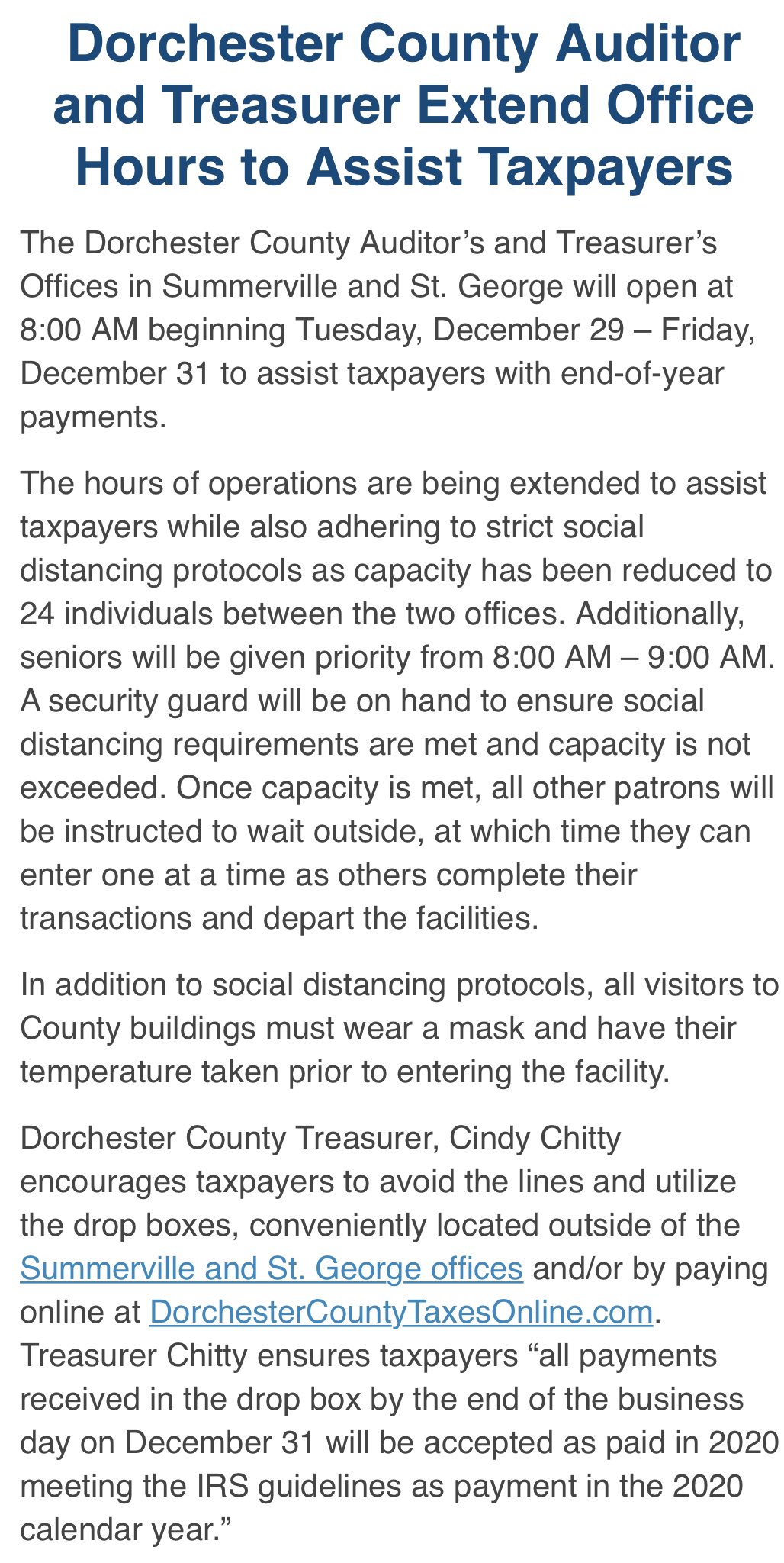 Holy City Sinner On Twitter Dorchester County Auditor And Treasurer Extend Office Hours To Assist Taxpayers