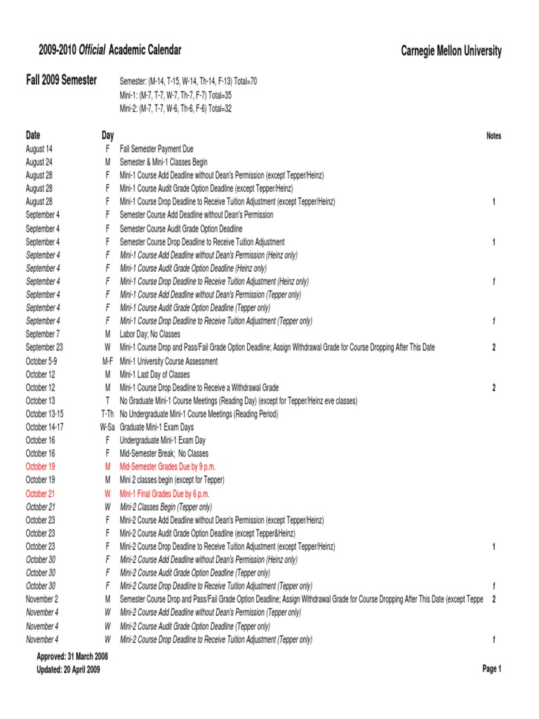 09 10 Academic Calendar Carnegie Mellon University Academic Term